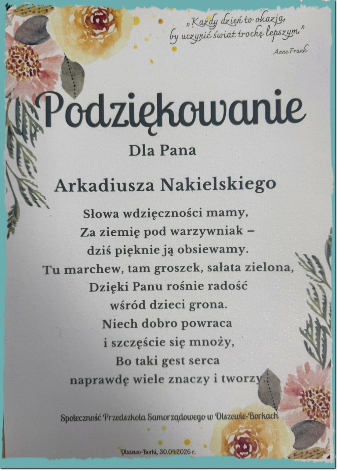 Z wielką radością dziękujemy Państwu za wspólną podróż przez te wspaniałe 50 lat. To dzięki Waszemu wsparciu i zaufaniu możemy celebrować wyjątkową rocznicę - jubileusz przedszkola. Nasza placówka jest miejscem pełnym radości, nauki i kreatywności, gdzie promujemy zdrowie, wartości patriotyczne oraz gdzie szanujemy prawa dziecka. Razem tworzymy niezapomniane chwile w życiu Waszych pociech. Wierzymy, że przyszłość przyniesie nam jeszcze więcej wspaniałych wspólnych chwil i osiągnięć. Razem możemy zdziałać naprawdę wielkie rzeczy!